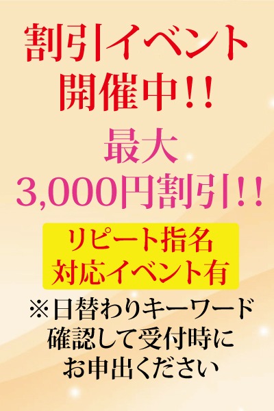 ▶90分コース(指名料1,000円込) 19,000円→17,000円 2,000円OFF ▶120分コース(指名料1,000円込) 25,000円→22,000円 3,000円OFF ▶150分コース以上(指名料1,000円込) 3,000円OFF 合言葉は当日セラピストの投稿をご確認ください。 ご予約時に合言葉をお申出ください。 ※当日X投稿のあるセラピストに限ります。 ※ご来店後のお申出には対応できません。 ※他イベントとの併用は出来ません。 ※リピート指名(本指名)は除きます。
